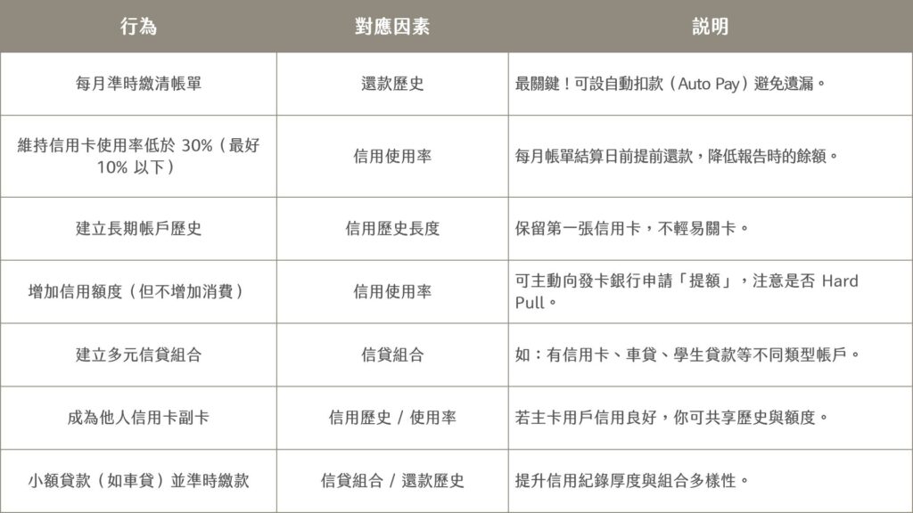 - 保持帳戶活躍但不要頻繁更動:信用歷史長度是重要加分項。